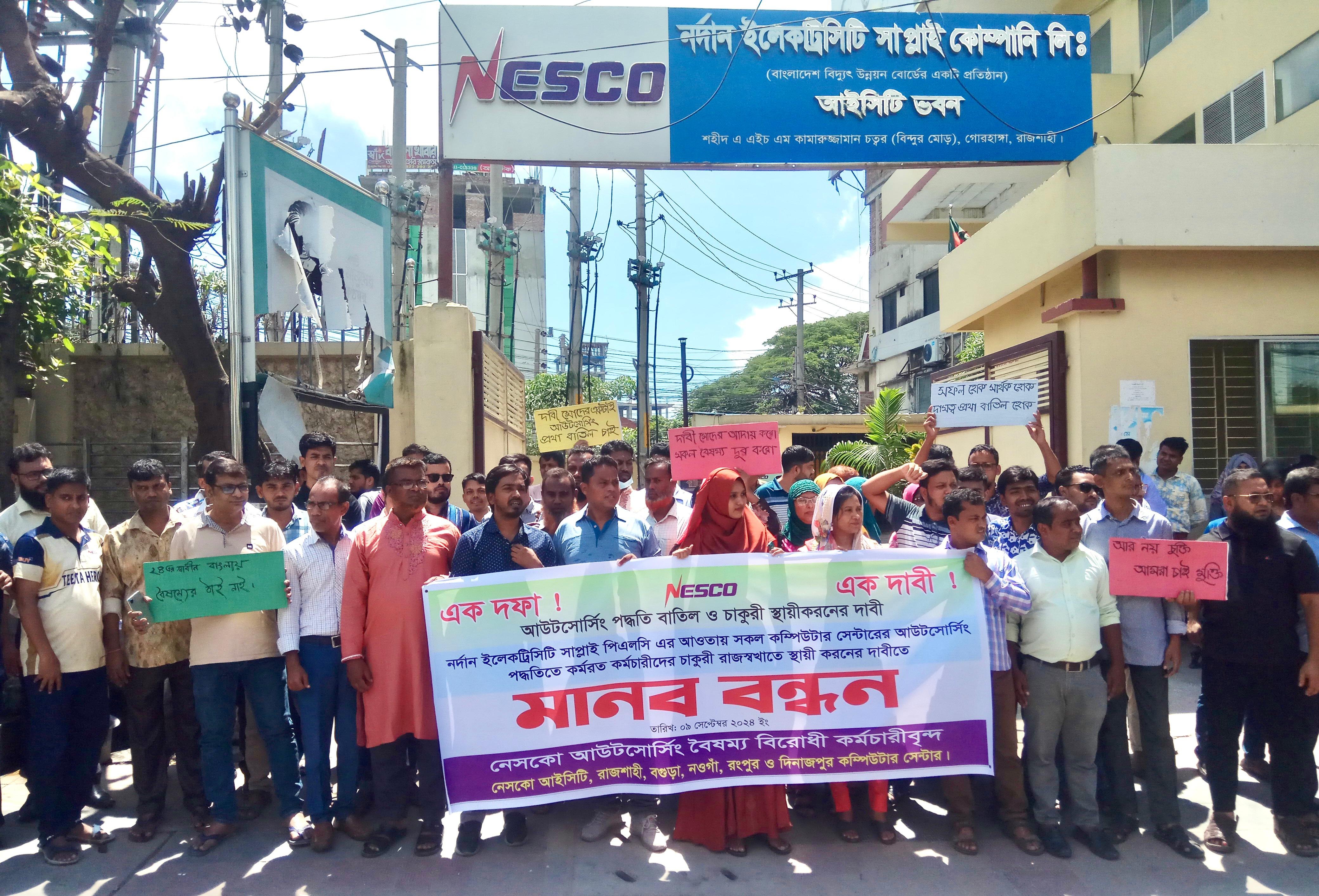 নর্দান ইলেকট্রিসিটি সাপ্লাই কোম্পানি পিএলসির (নেসকো) আউটসোর্সিং পদ্ধতি বাতিল ও চাকরি স্থায়ীকরণের দাবিতে মানববন্ধন অনুষ্ঠিত হয়েছে। আজ সোমবার দুপুরে রাজশাহী নগরীর রেলগেট এলাকায় এই কর্মসূচি পালন করেন নেসকো আউটসোর্সিং বৈষম্য বিরোধী কর্মচারীরা।