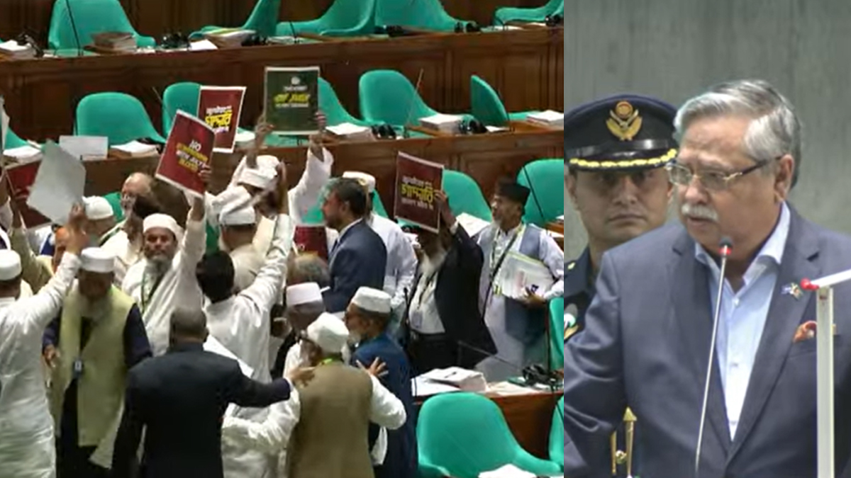 এ সময় বিরোধী দল জামায়াতে ইসলামীর সংসদ সদস্যরা দাঁড়িয়ে এর প্রতিবাদ জানান। তাদের হাতে দেখা গেছে প্ল্যাকার্ড, যাতে লেখা ‘জুলাই নিয়ে গাদ্দারি চলবে না’।
