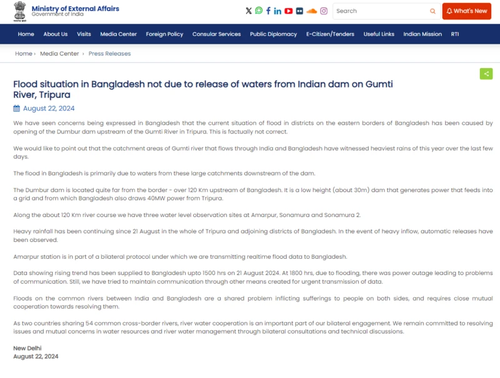 ভারতের পররাষ্ট্র মন্ত্রণালয় আরও জানিয়েছে, ভারত ও বাংলাদেশের মধ্যে ৫৪টি অভিন্ন নদী থাকায় দুই দেশের জন্যই বন্যা এমন একটি সমস্যা, যা জনগণের জীবনে দুর্ভোগ সৃষ্টি করে। এ সমস্যা সমাধানে দ্বিপাক্ষিক পরামর্শ প্রয়োজন বলেও এখানে উল্লেখ করা হয়।